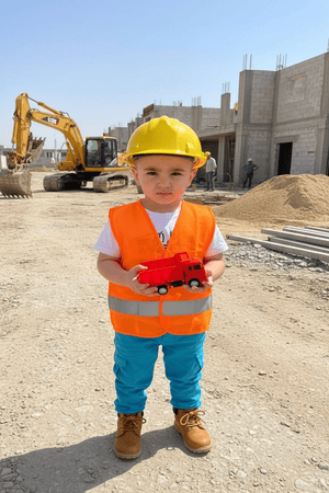 إبراهيم يرتدي زي المهندس الصغير، يحمل بين عينيه طموحًا كبيرًا لبناء مستقبل مشرق.
