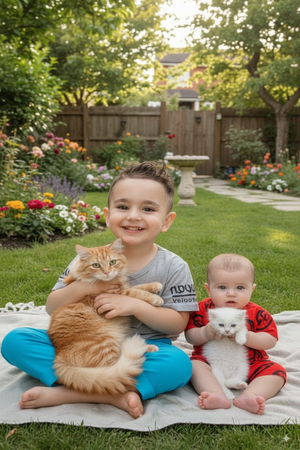 إبراهيم وأيهم يجلسان مع القطط بمحبة، يزرعان معًا بذور الرحمة والود في قلوبهما.